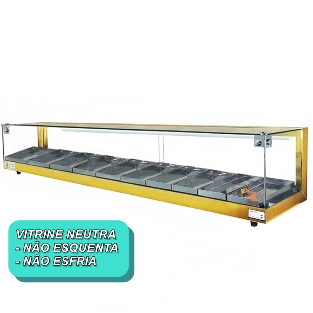 A Vitrine NEUTRA foi desenvolvida para a exposição de produtos que são armazenados em temperatura ambiente , sendo alguns deles .Salgadinhos , biscoitos , balas , gomas de mascar , entre outros produtos que não necessitam de aquecimento e refrigeração .Portanto não é refrigerada , nem quente , apenas mantém os alimentos na temperatura ambiente .