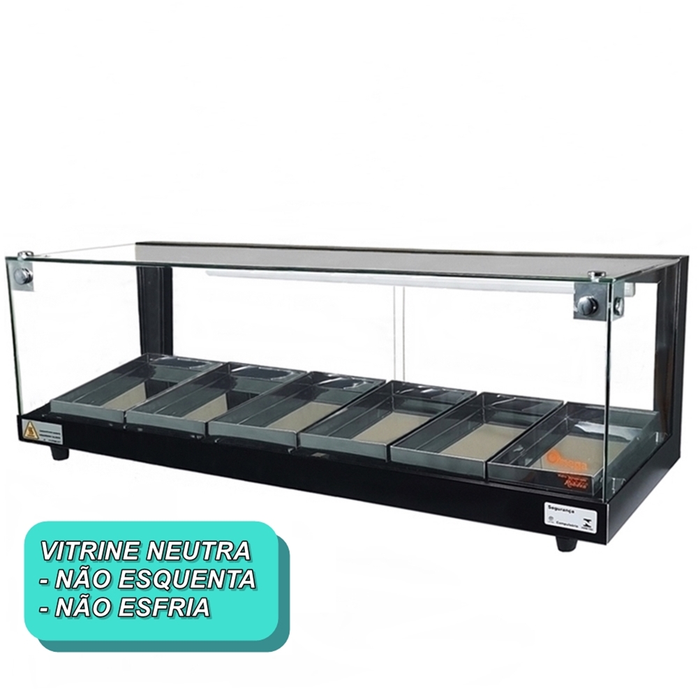 A Vitrine NEUTRA foi desenvolvida para a exposição de produtos que são armazenados em temperatura ambiente , sendo alguns deles .Salgadinhos , biscoitos , balas , gomas de mascar , entre outros produtos que não necessitam de aquecimento e refrigeração .Portanto não é refrigerada , nem quente , apenas mantém os alimentos na temperatura ambiente .