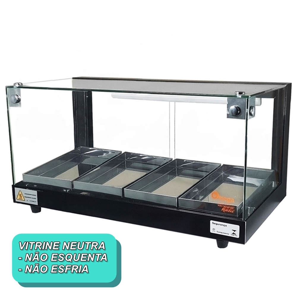 A Vitrine NEUTRA foi desenvolvida para a exposição de produtos que são armazenados em temperatura ambiente , sendo alguns deles .Salgadinhos , biscoitos , balas , gomas de mascar , entre outros produtos que não necessitam de aquecimento e refrigeração .Portanto não é refrigerada , nem quente , apenas mantém os alimentos na temperatura ambiente .