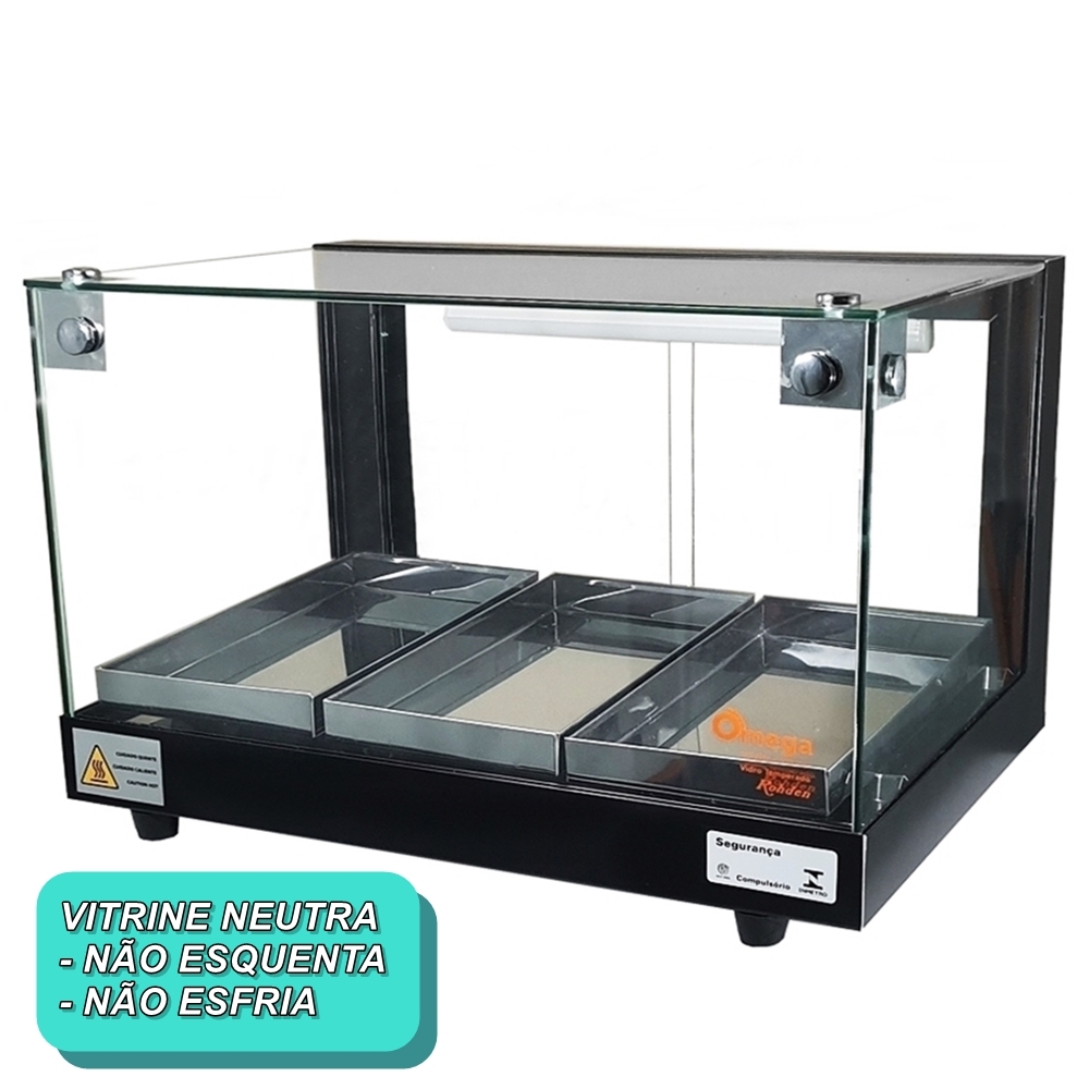 A Vitrine NEUTRA foi desenvolvida para a exposição de produtos que são armazenados em temperatura ambiente , sendo alguns deles .Salgadinhos , biscoitos , balas , gomas de mascar , entre outros produtos que não necessitam de aquecimento e refrigeração .Portanto não é refrigerada , nem quente , apenas mantém os alimentos na temperatura ambiente .