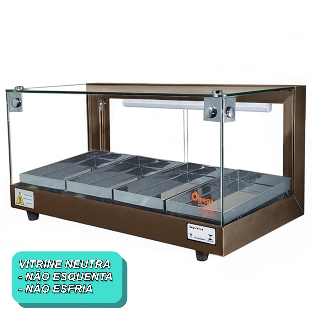 A Vitrine NEUTRA foi desenvolvida para a exposição de produtos que são armazenados em temperatura ambiente , sendo alguns deles .Salgadinhos , biscoitos , balas , gomas de mascar , entre outros produtos que não necessitam de aquecimento e refrigeração .Portanto não é refrigerada , nem quente , apenas mantém os alimentos na temperatura ambiente .
