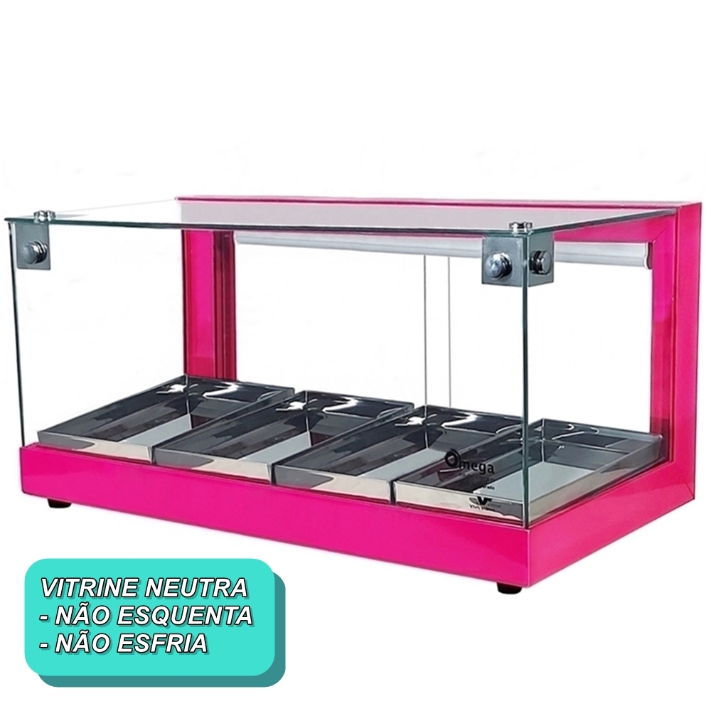 A Vitrine NEUTRA foi desenvolvida para a exposição de produtos que são armazenados em temperatura ambiente , sendo alguns deles .Salgadinhos , biscoitos , balas , gomas de mascar , entre outros produtos que não necessitam de aquecimento e refrigeração .Portanto não é refrigerada , nem quente , apenas mantém os alimentos na temperatura ambiente .