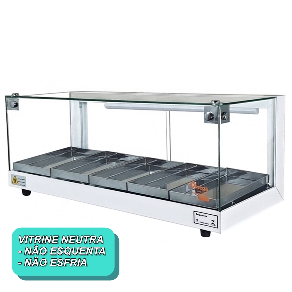 A Vitrine NEUTRA foi desenvolvida para a exposição de produtos que são armazenados em temperatura ambiente , sendo alguns deles .Salgadinhos , biscoitos , balas , gomas de mascar , entre outros produtos que não necessitam de aquecimento e refrigeração .Portanto não é refrigerada , nem quente , apenas mantém os alimentos na temperatura ambiente .